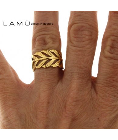 Anello regolabile fascia larga con ramo di foglie in acciaio inox oro - Lamù gioielli