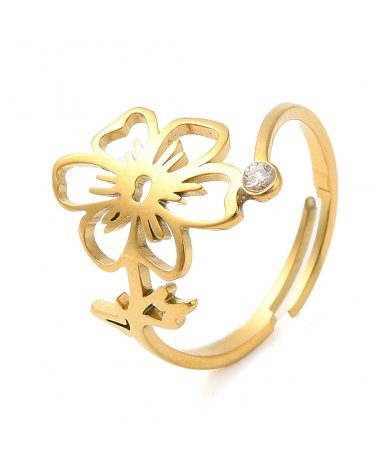 Anello regolabile con fiore e zircone in acciaio inox oro