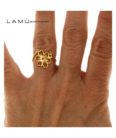 Anello regolabile con fiore e zircone in acciaio inox oro - Lamù gioielli