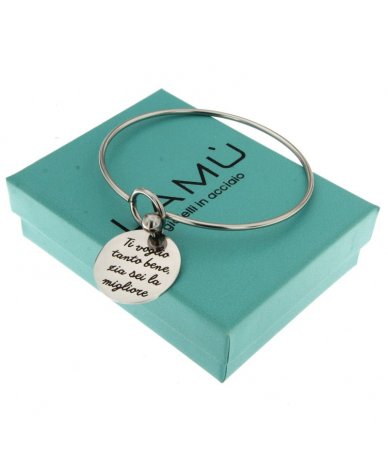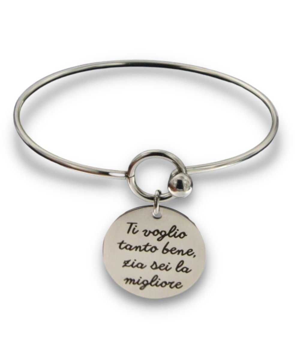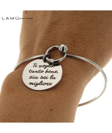 Bracciale rigido in acciaio inox con tondo inciso "Ti voglio tanto bene, zia sei la migliore"