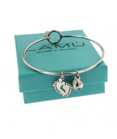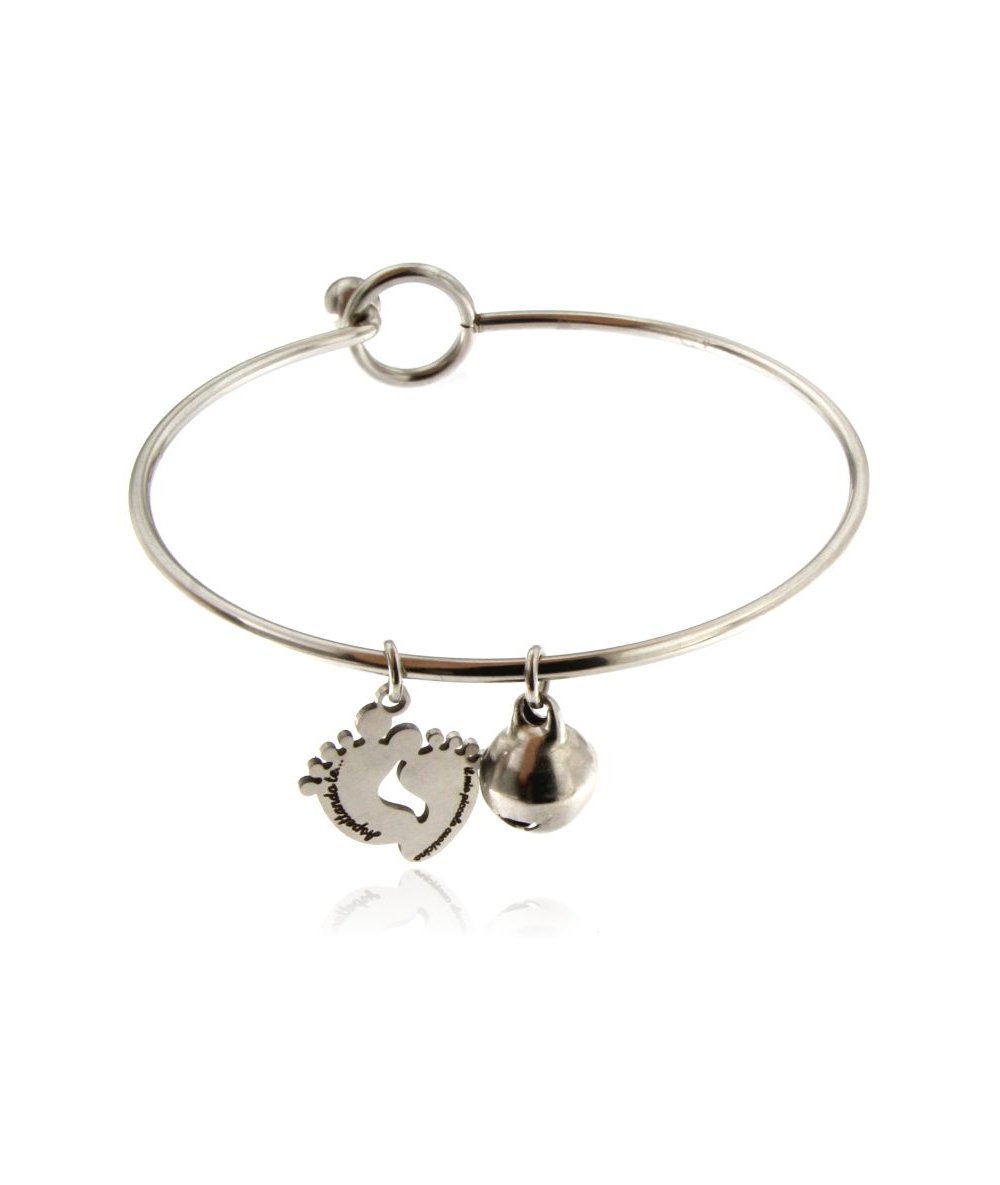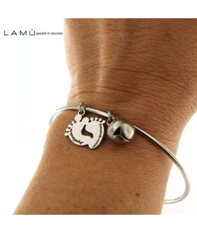 Bracciale rigido in acciaio inox con piedini incisi "Aspettando te il mio piccolo cuoricino"