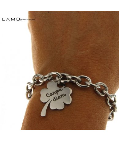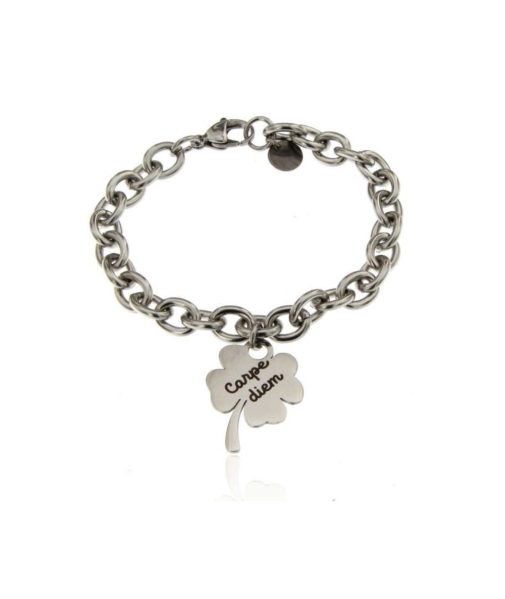 Bracciale in acciaio inox con pendente quadrifoglio inciso "Carpe diem"