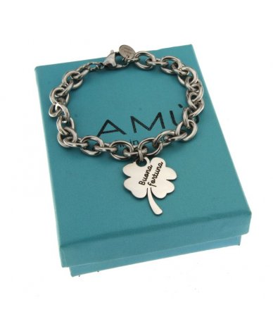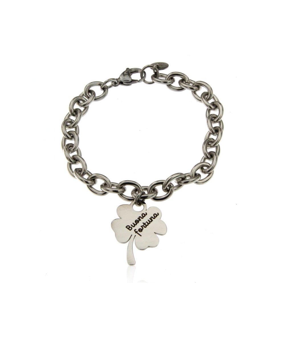 Bracciale in acciaio inox con pendente quadrifoglio inciso "Buona Fortuna"