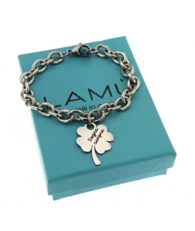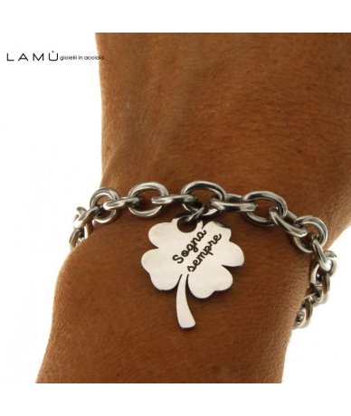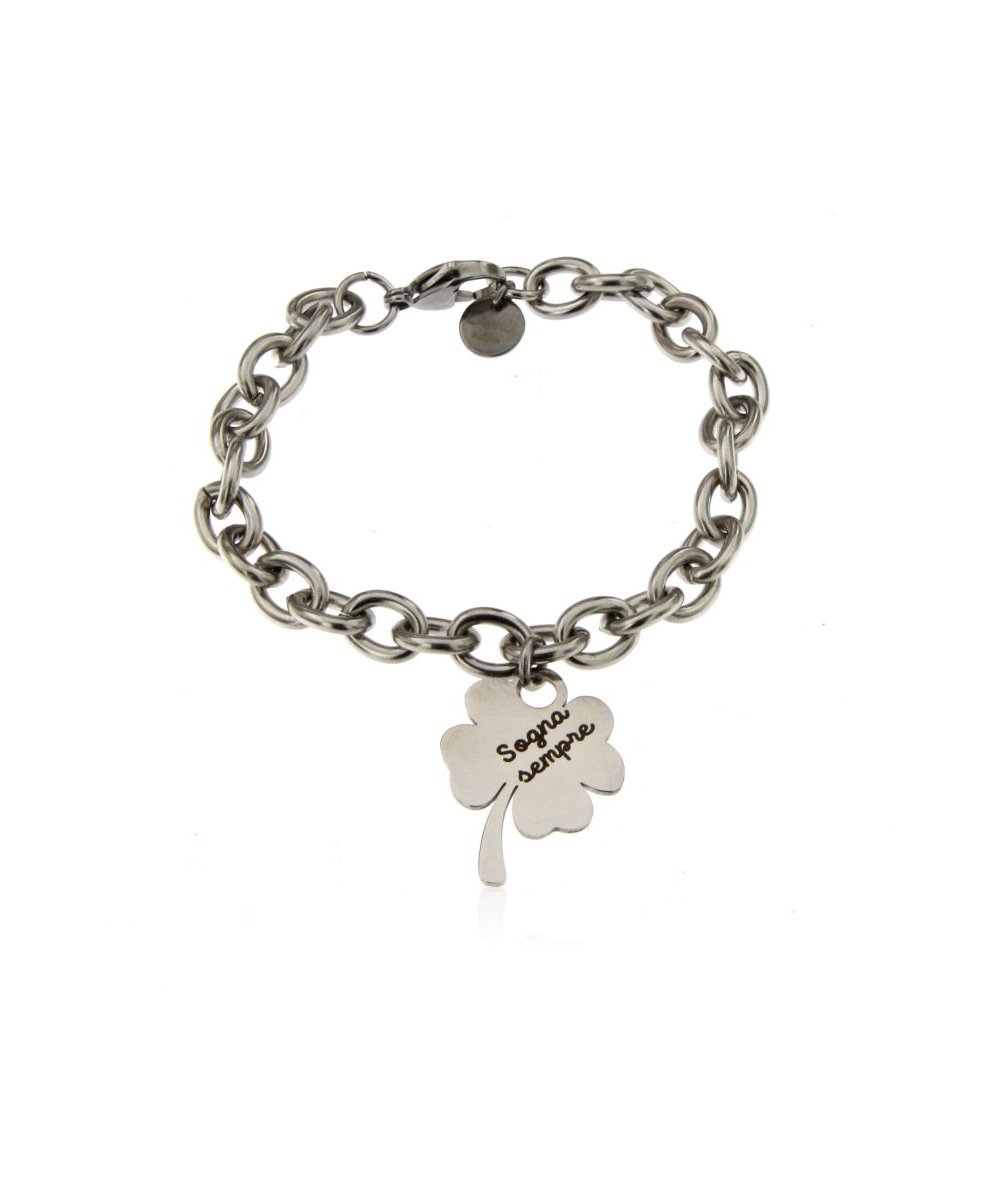 Bracciale in acciaio inox con pendente quadrifoglio inciso "Sogna sempre"