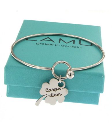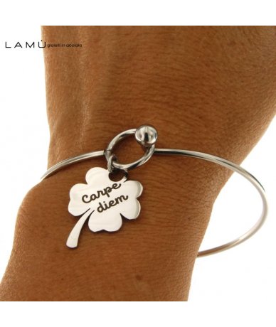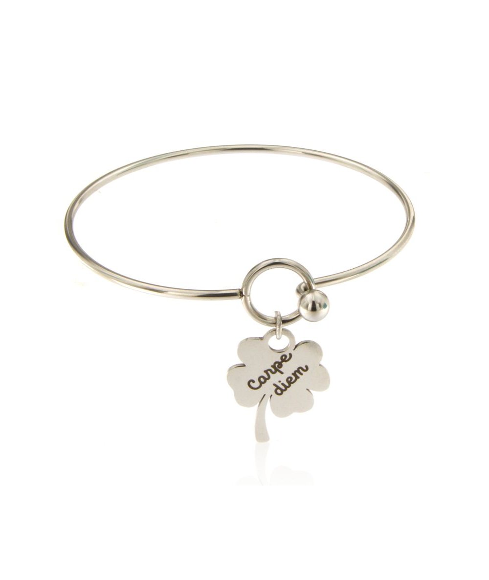 Bracciale rigido con quadrifoglio inciso "Carpe diem"