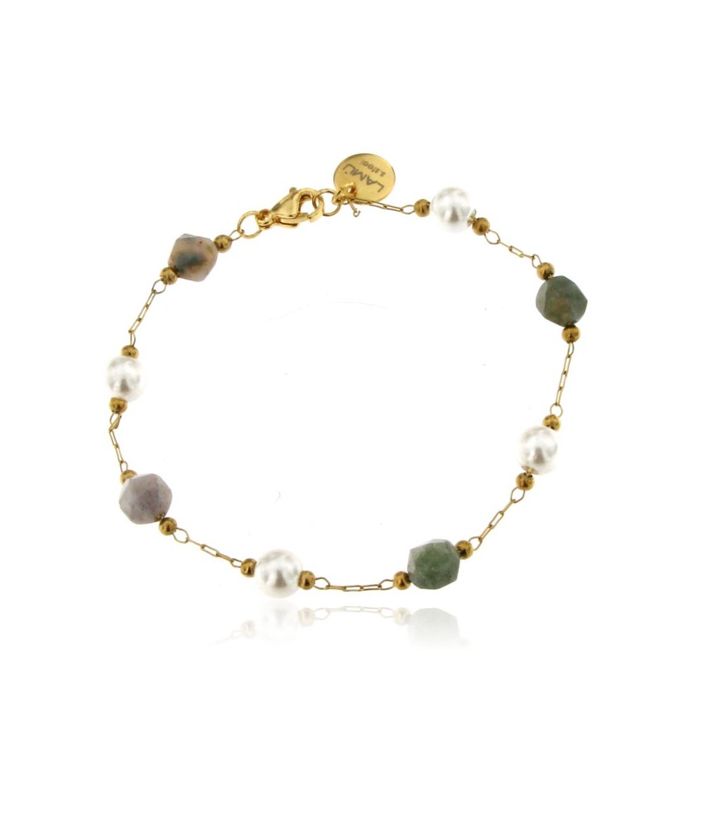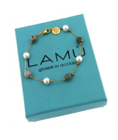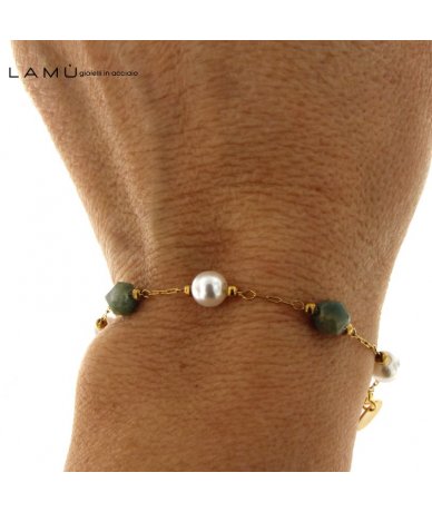 - Bracciale con perle e agata indiana in acciaio inox oro