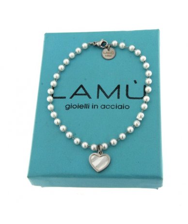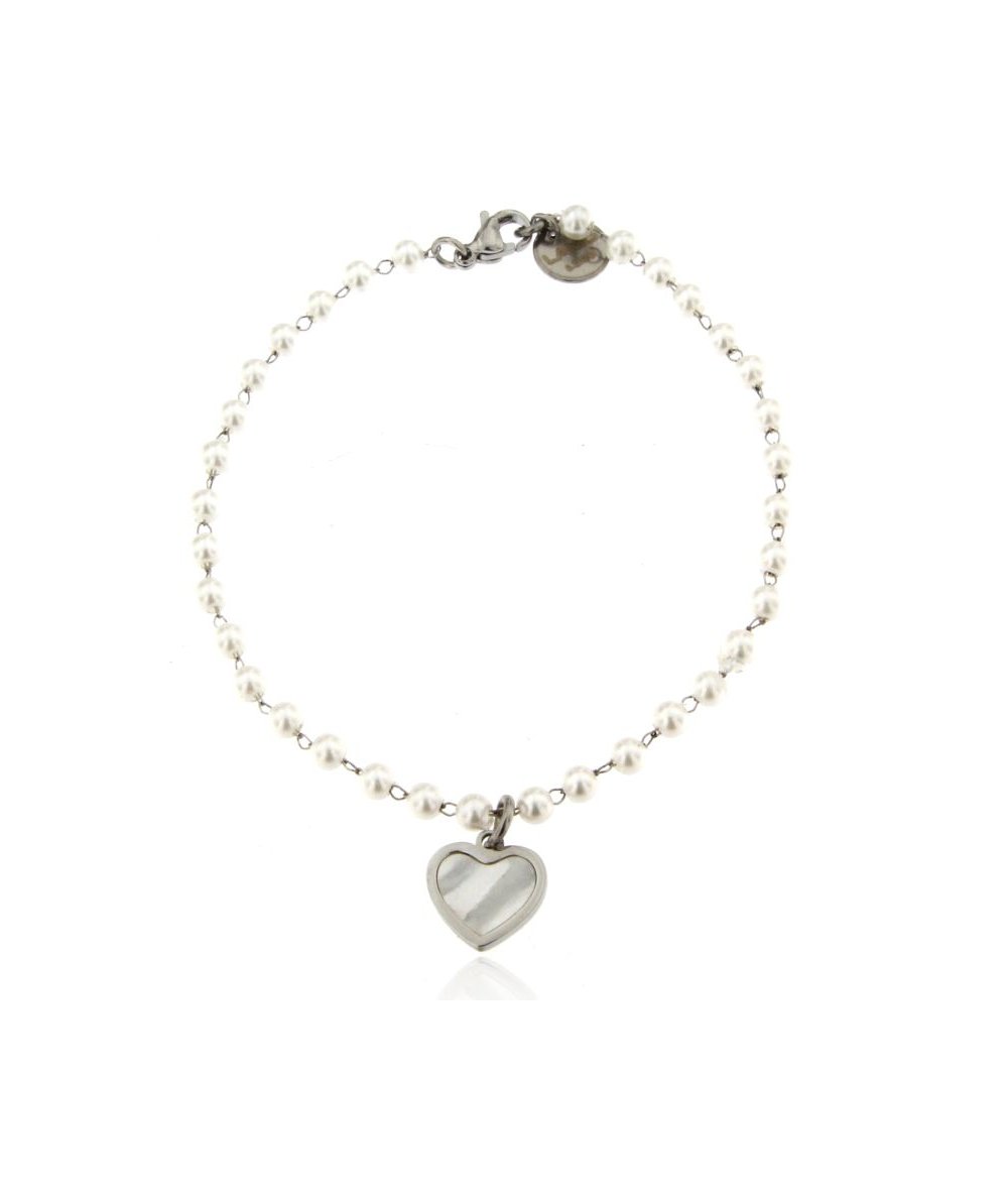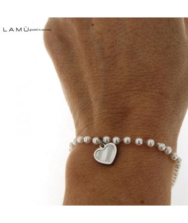 Bracciale in acciaio inox e perline bianche con pendente cuore in conchiglia - Lamù Gioielli