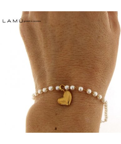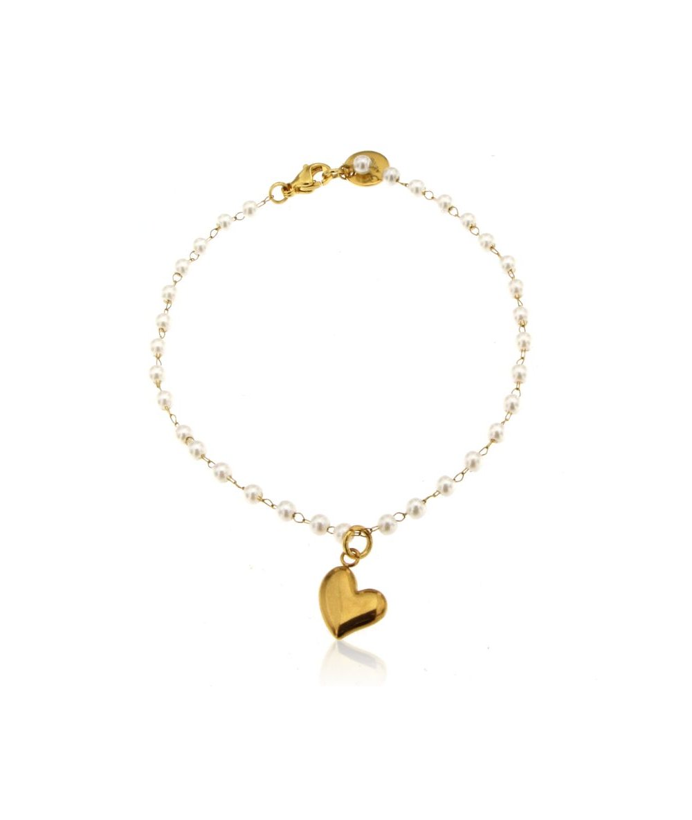 Bracciale in acciaio inox oro e perline bianche con pendente cuore