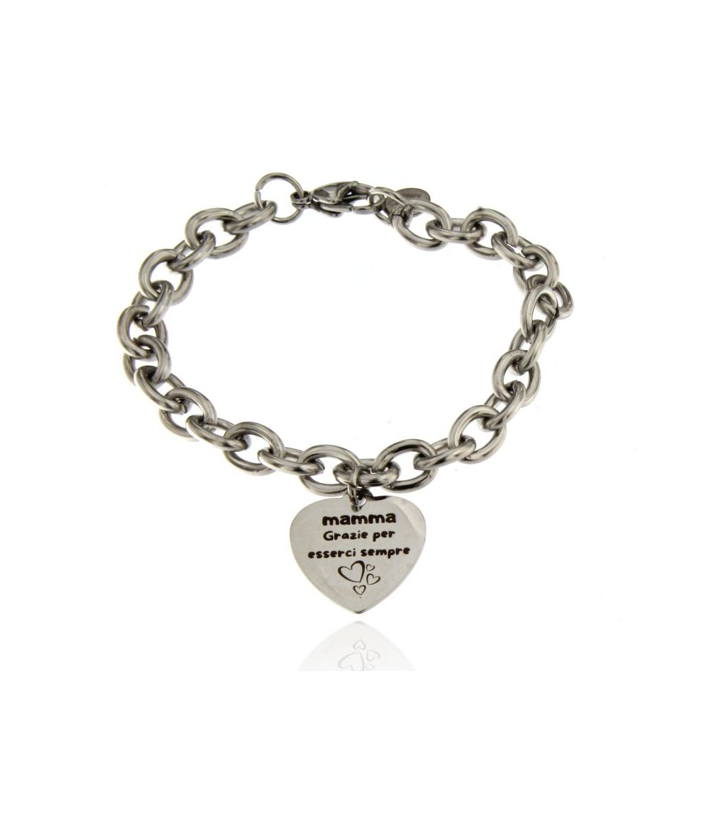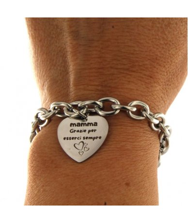 Bracciale in acciaio inox con pendente cuore inciso "mamma grazie per esserci sempre"