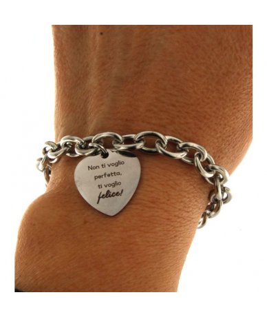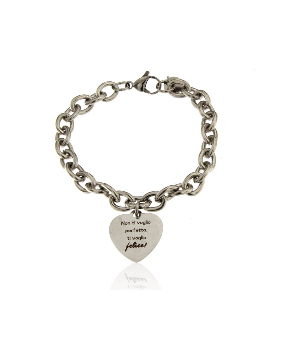 Bracciale in acciaio inox con pendente cuore inciso "Non ti voglio perfetta, ti voglio felice"