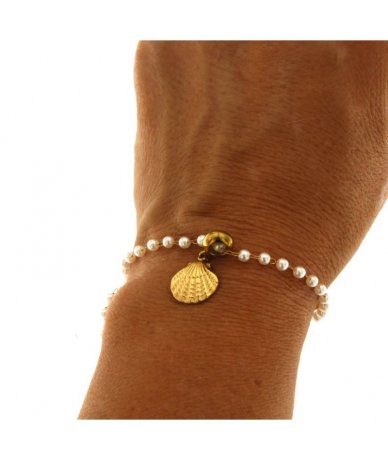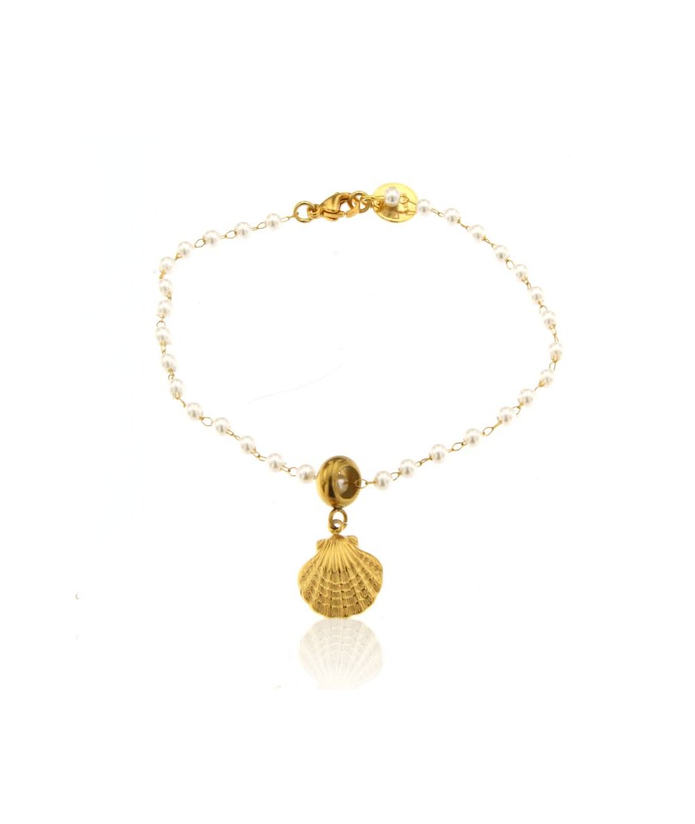 Bracciale in acciaio inox oro e perline bianche con pendente conchiglia