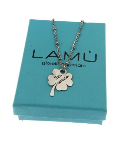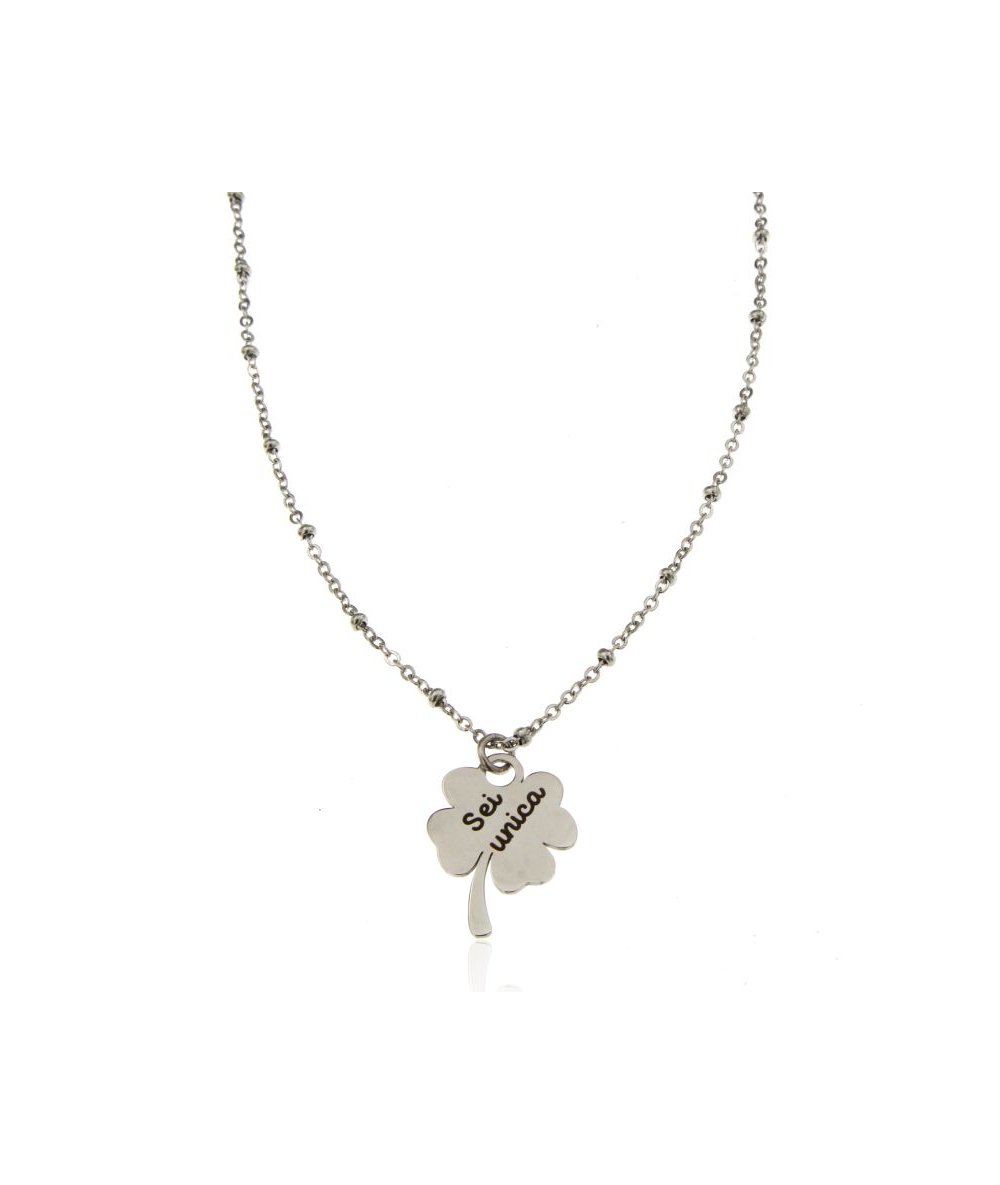 Collana in acciaio inox con pendente quadrifoglio inciso "Sei unica"