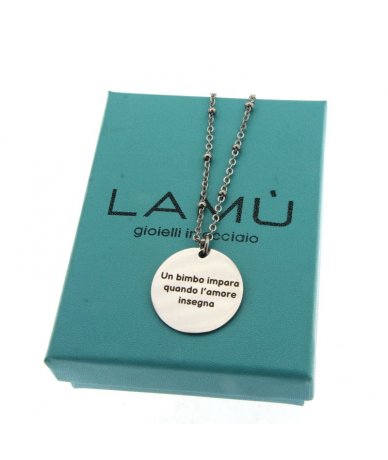 Collana in acciaio inox con pendente tondo inciso "Un bimbo impara quando l'amore insegna"
