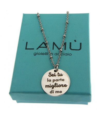 Collana in acciaio inox con pendente tondo inciso "Sei tu la parte migliore di me"