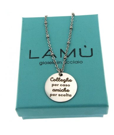 Collana in acciaio inox con pendente tondo inciso "Colleghe per caso amiche per sempre"