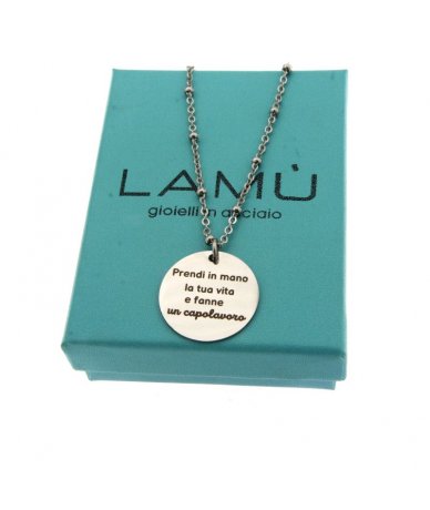Collana in acciaio inox con pendente tondo inciso "Prendi in mano la tua vita e fanne un capolavoro"