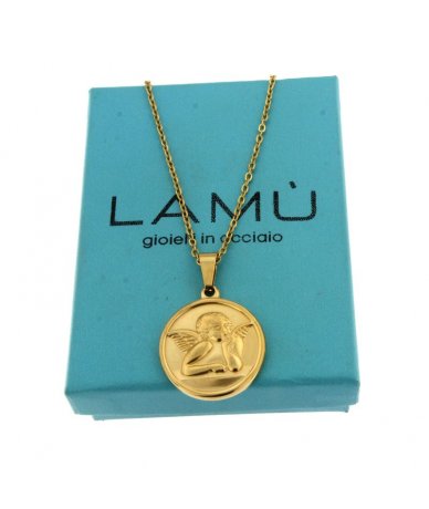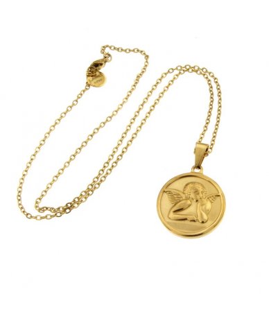 Collana in acciaio inox oro con pendente tondo con angelo a rilievo