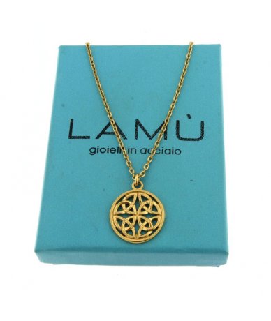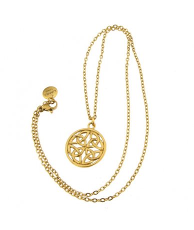 Collana in acciaio inox oro con pendente tondo con nodo trinità
