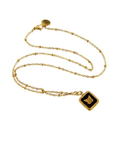 Collana con medaglietta smaltata nera con farfalla in acciaio inox oro 18k