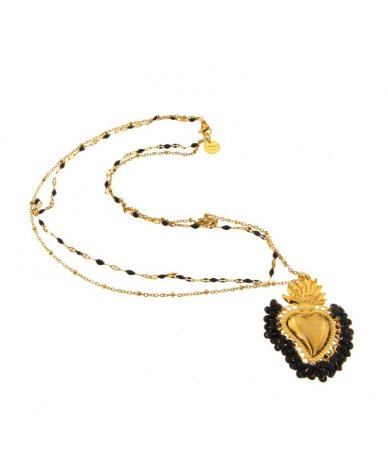 Collana doppia catena con pendente cuore sacro con perline nere in acciaio inox finitura oro 18k