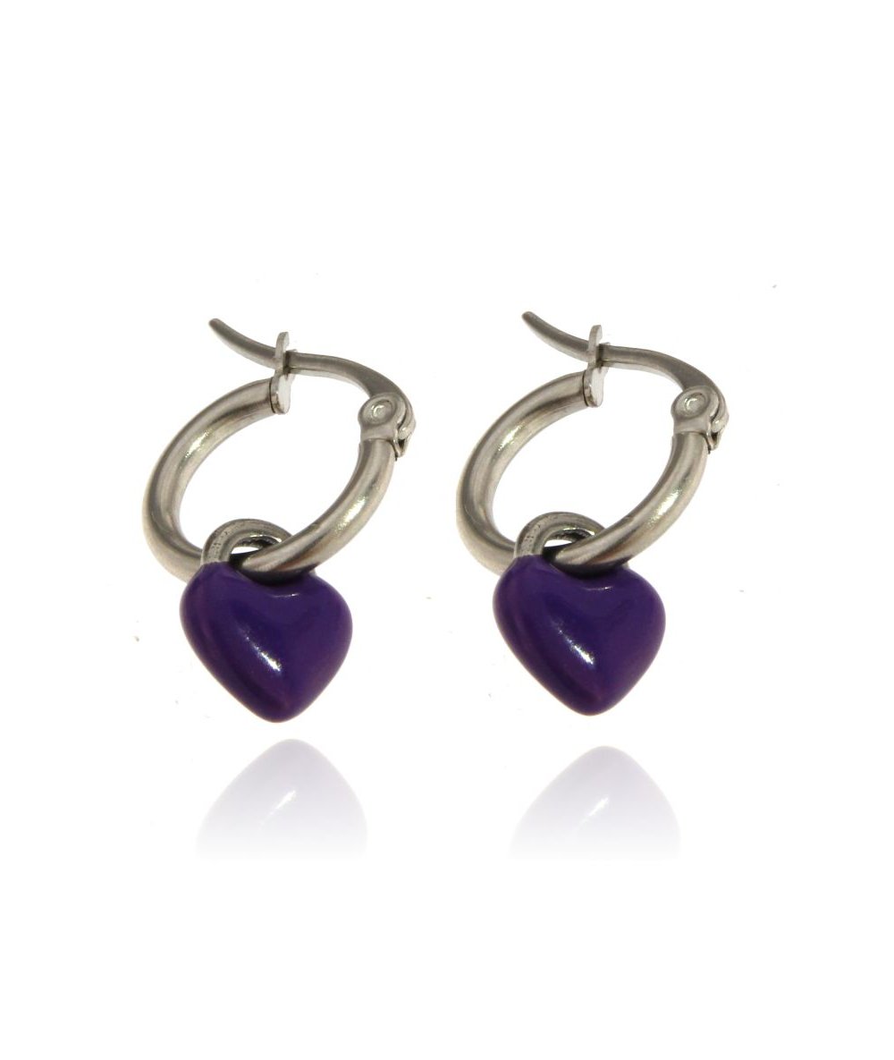 Orecchini cerchi in acciaio con cuore bombato smaltato viola