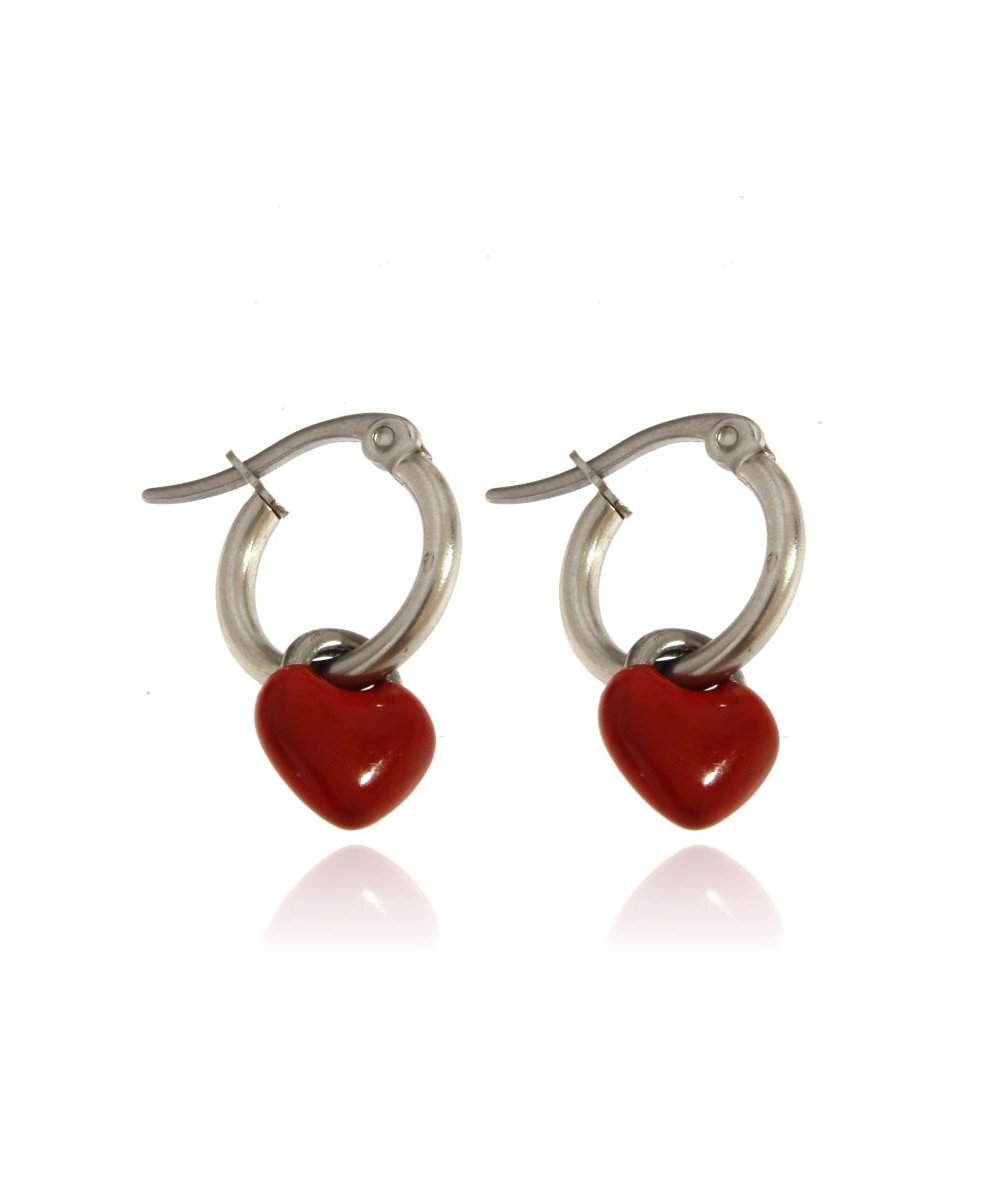 Orecchini cerchi in acciaio con cuori bombati smaltati rossi