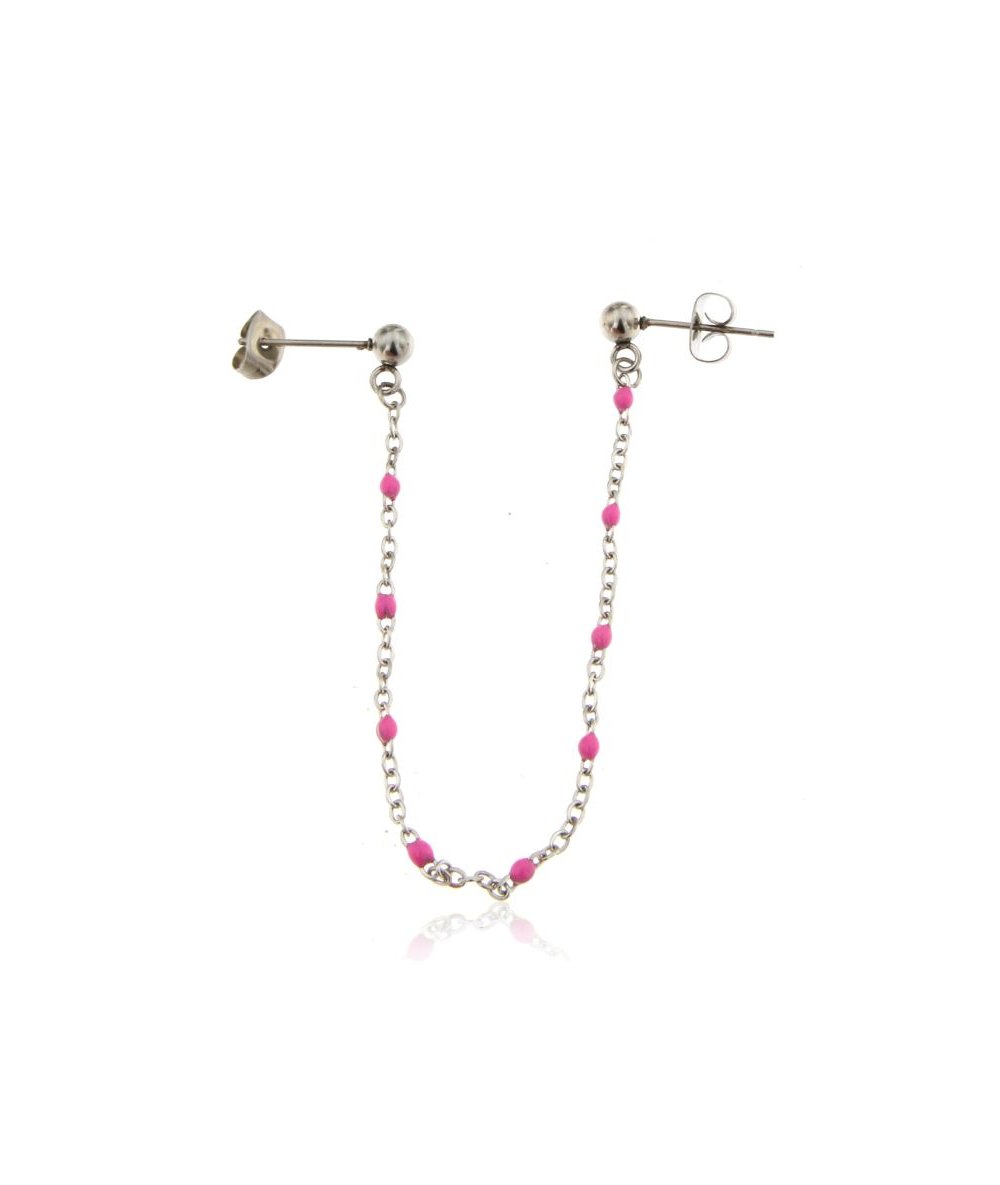 Orecchino per doppio buco con catena in acciaio inox smaltata fucsia