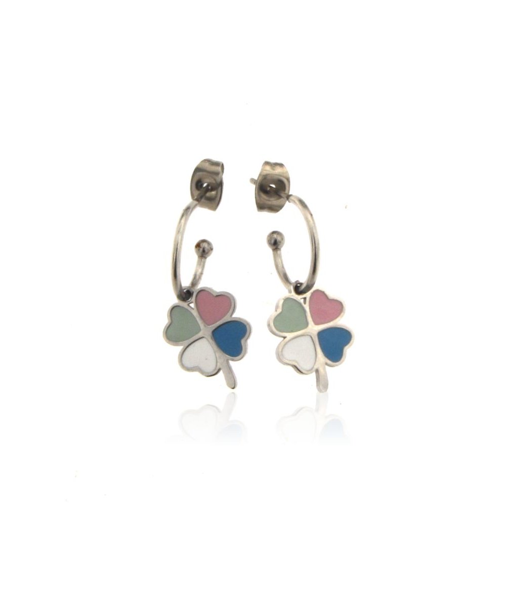 Orecchini cerchi in acciaio inox con pendente quadrifoglio multicolore