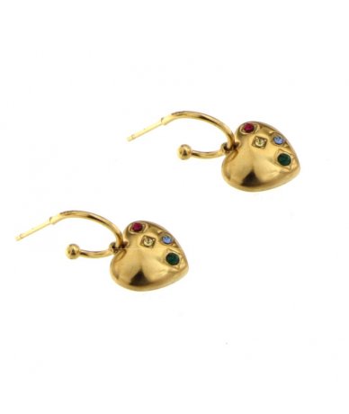 Orecchini cerchi in acciaio inox oro 18k con pendente cuore bombato con strass multicolore