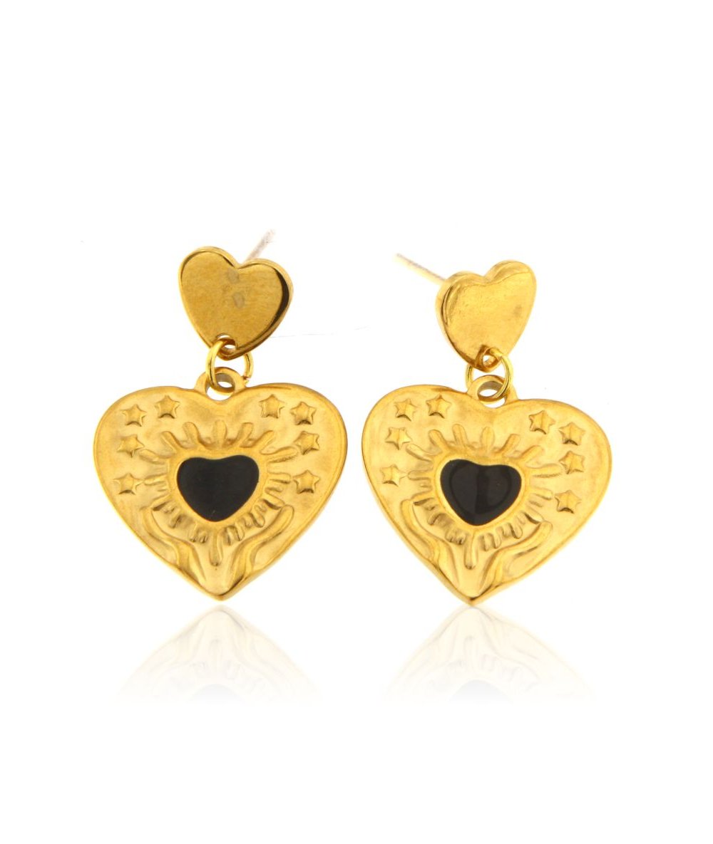Orecchini con supporti cuore e pendente cuore sacro smaltato nero in acciaio inox placcato oro 18k