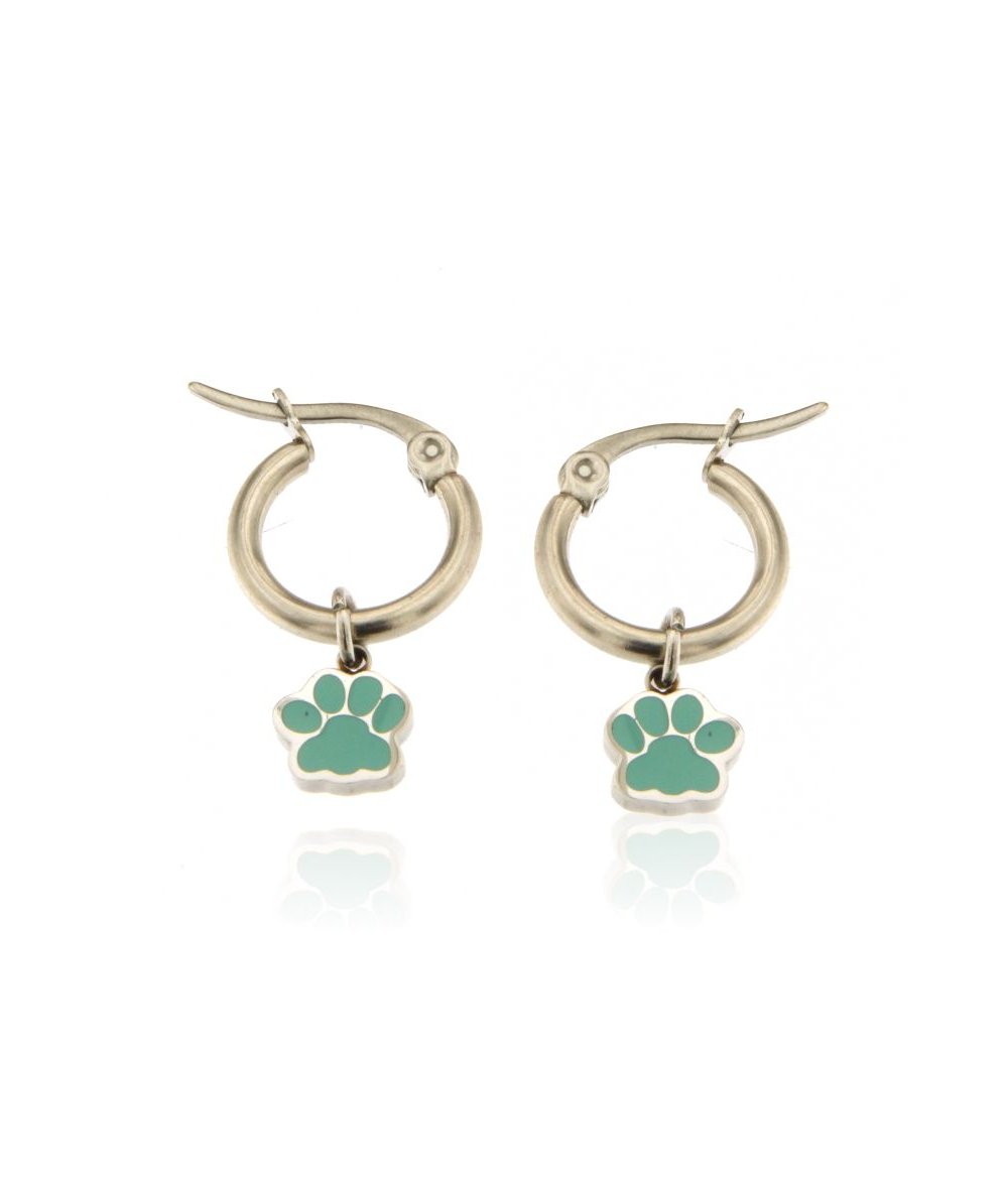 Orecchini cerchi con pendente orma zampa smaltata verde acqua in acciaio inox