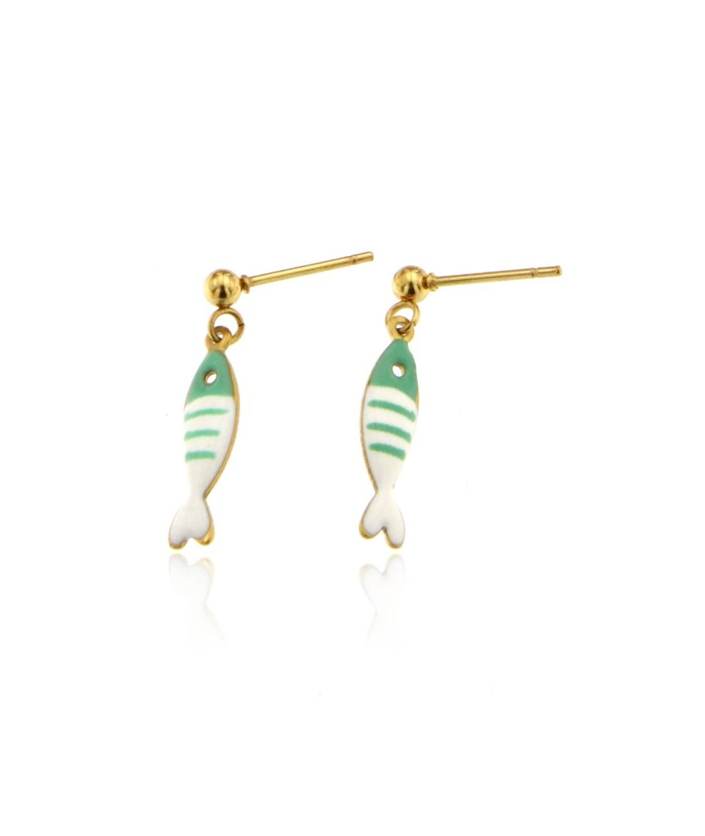 Orecchini pendenti con pesciolini smaltati verde acqua in acciaio inox placcato oro 18k