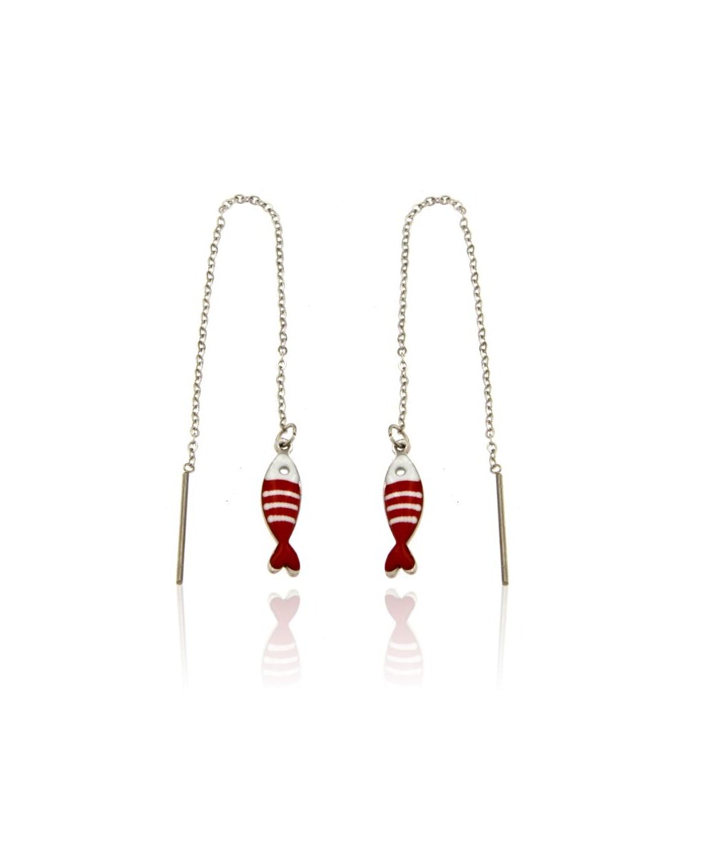Orecchini lunghi saliscendi in acciaio inox con pendente pesciolino rosso