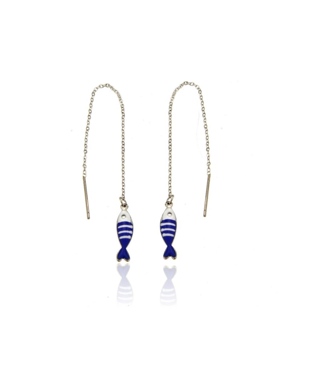 Orecchini lunghi saliscendi in acciaio inox con pendente pesciolino blu