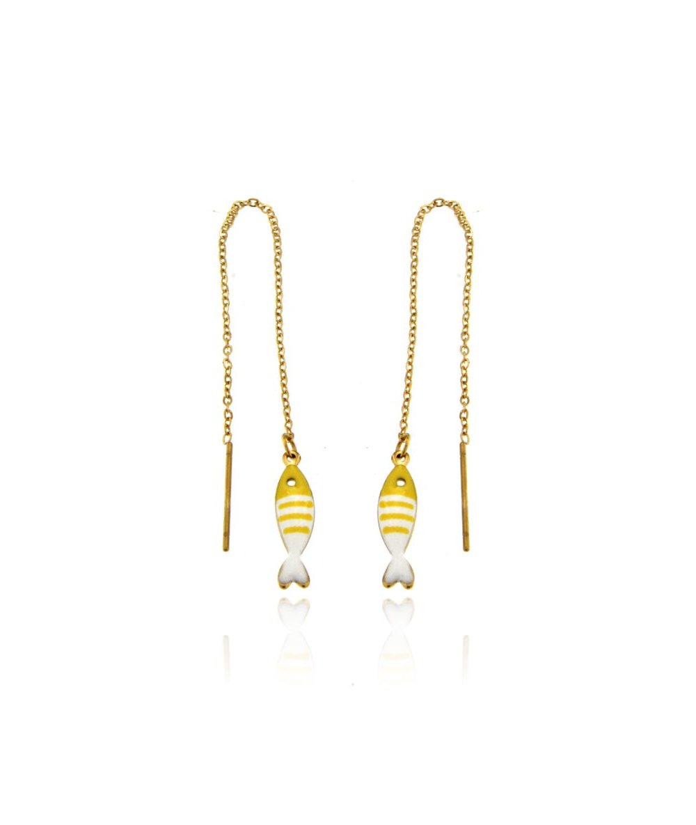 Orecchini lunghi saliscendi in acciaio inox oro con pesciolino giallo