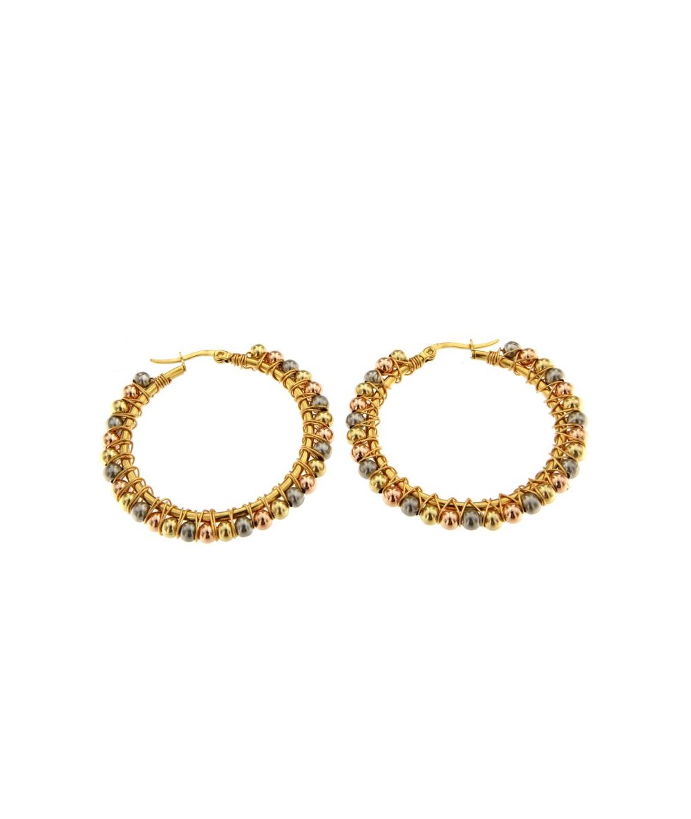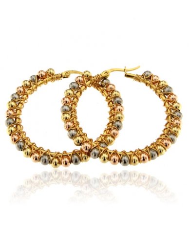 Orecchini cerchi con sfere tricolor in acciaio inox, acciaio inox placcato oro rosa e acciaio inox placcato oro 18k