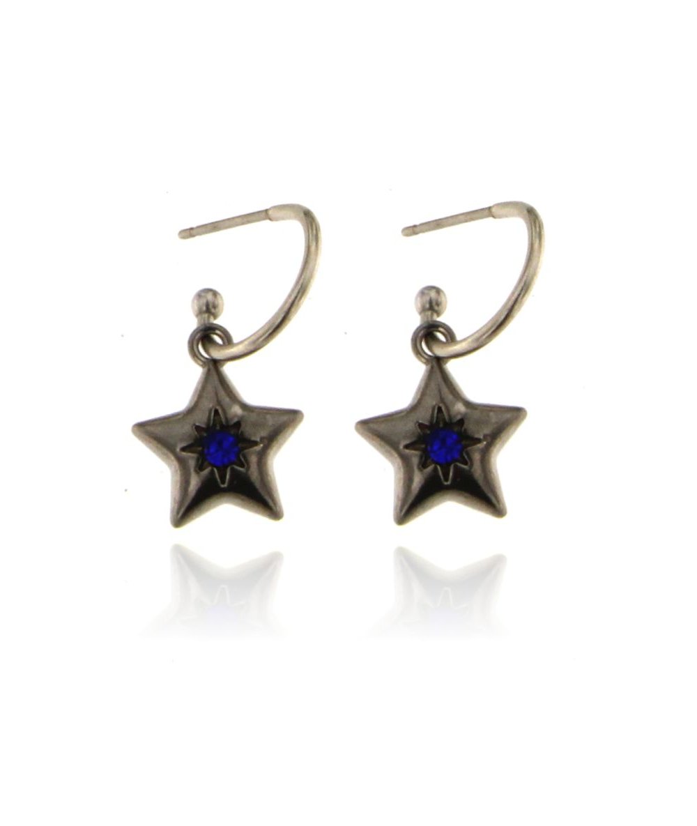 Orecchini semicerchi con pendente stella con punto luce colore blu in acciaio inox