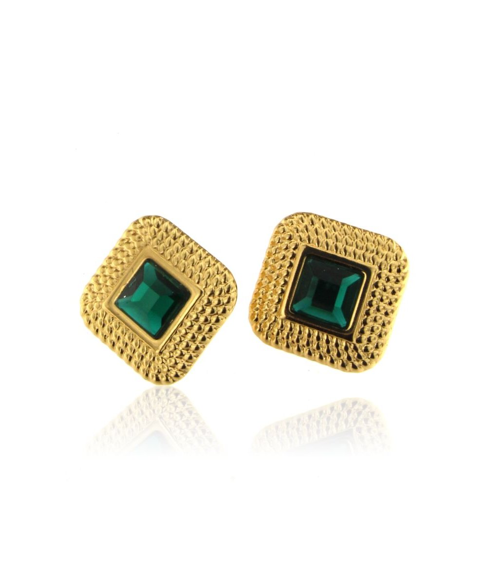 Orecchini rombi in acciaio inox placcato oro 18k con centrale in vetro verde