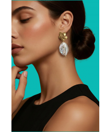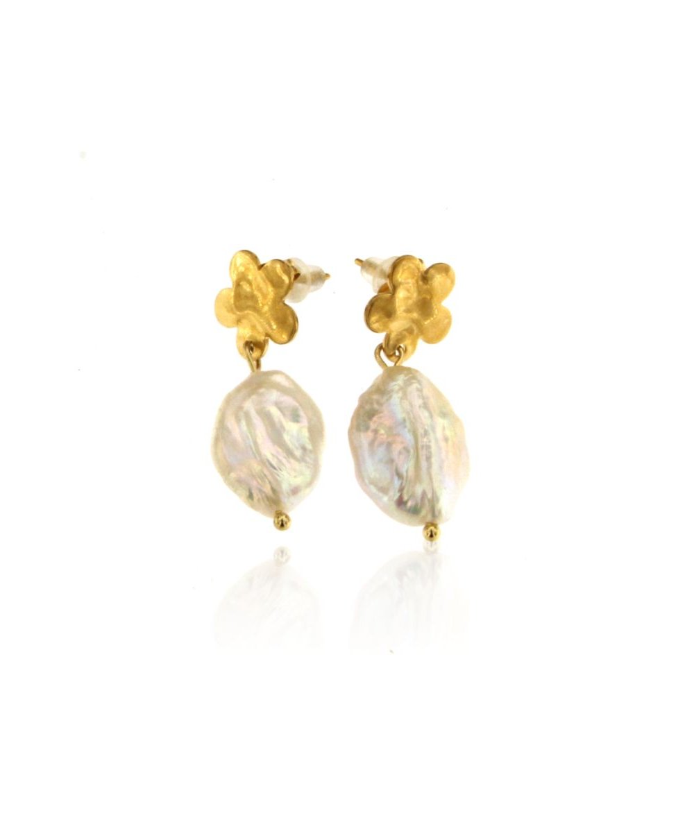 Orecchini con supporto margherita in acciaio inox placcato oro 18k e pendente perle naturali keshi barocche